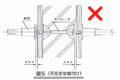 図5のように不完全な組み付けを行うと型枠内の側圧により、セパレーターのネジ山が破断したり、締付金物のクサビ等が外れ型枠破損の要因に成ります。