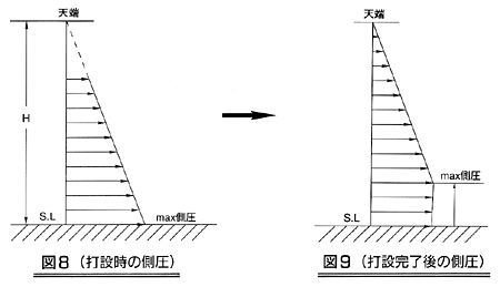 (ロ)壁厚の寸法が小さく、S.Lから天瑞までの高さH (図8)が高くなればなる程、又打設コンクリートの速度が速ければ速い程、液体圧に近くなり、側圧は異常に大きくなります。そしてスランプ、効果進捗度、外気温等複雑な要素に影響されるので、打設に当っては充分な注意が必要と成ります。
