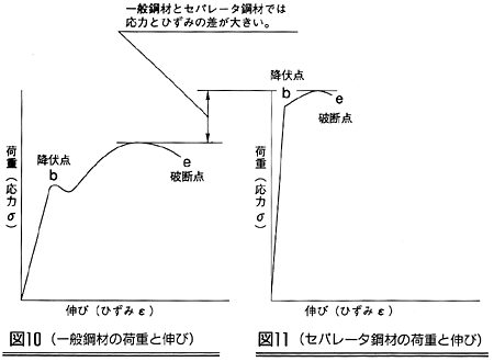 まで冷間引き抜き(Reroll)しますので線材表面 が加工硬化を起し、一般鋼材に較べ引張り強度が非常に高く、しかも伸びの少ない材料に成っています(図11)。又製品加工に際しては、切削加工ではなく転造加工されているため、断面積をそこなうことなく、転造加工硬化も加わってより強い製品化が計られています。